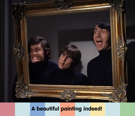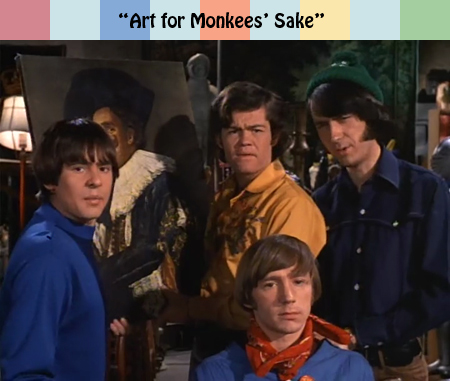 “Art for Monkees’ Sake” was directed by Alex Singer and written by Coslough Johnson. It debuted October 9, 1967. The episode title is a play on the French slogan, “Art for Art’s Sake” (l’art pour l’art) which means art for reasons of self-expression and not for any instructional, moral, or other useful purpose. The Monkees are most often comedy for comedy’s sake, and I love it.