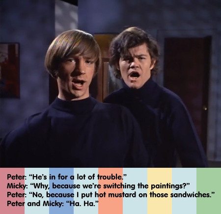 They set Peter up to copy “The Laughing Cavalier,” painted in 1624 by Dutch Golden Age painter Franz Hals. Chuche and Duce whisper their plan to steal the real painting and put Peter’s in its place. Meanwhile, Mike, Micky, and Davy worry about Peter. Mike considers the idea that he may have insulted Peter, but Micky says, “Well to insult somebody, they have to understand you.” Which is a slight to Peter’s intelligence, but on the other hand going through life never being offended would be a beautiful thing. Maybe not so dumb after all. At the museum, Peter has completed his copy, but he’s dressed the Cavalier in Mike’s green wool hat. Duce chides him, “I know it’s knitted, but it’s not needed.” They move Peter to the basement to fix the painting because the museum’s about to close.