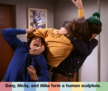 Micky, Mike, and Davy are in the museum corridor. They decide to split up and check the various studios but head into each other instead of around each other, and there’s physical comedy as they try to get by each other. Silly and childish, but still funny. Also a meta-comment on the episode as the shape they make is a human sculpture. Mike redistributes the studio assignments and the three head away from each other.