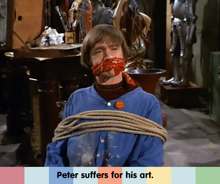The thieving guards hang Peter’s fake in the museum. Micky, Mike, and Davy finally find Peter tied up and gagged in the museum basement. They compliment his “copy” of “The Laughing Cavalier” but Peter explains, “The man who painted that was brilliant.” Monkees in unison say: “That means they’ve switched the paintings.” Cut to a shot of Peter’s copy in the museum with Peter’s rather obvious signature in white paint.