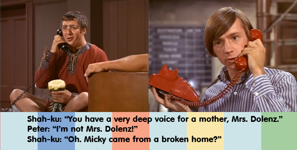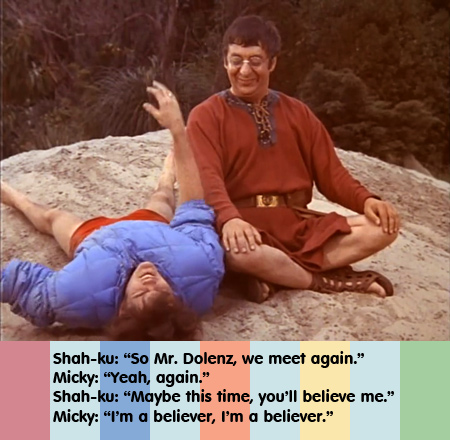 At the Monkees pad, Davy and Peter talk about Micky doing Shah-ku’s program on a week-to-week basis. Micky collapses from fasting to “purify his tissues.” With an unusually take-charge attitude (another example of something Mike would’ve done), Peter decides to call Shah-ku. He makes the red phone materialize in his hand and tells Shah-ku he’s very worried about Micky. Shah-ku tells Peter to move Micky to “stage two.” There’s also some amusing Monkees-writer logic as Shah-ku takes another jab at the Monkees masculinity: