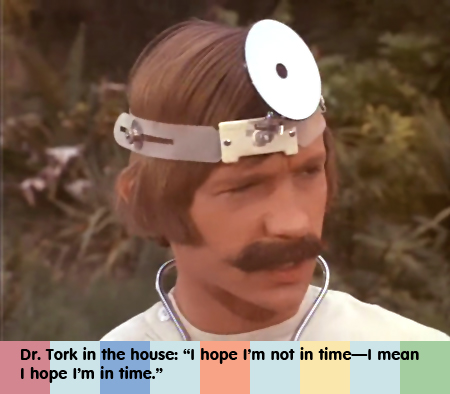 Micky makes dinner for Peter and Davy. To their extreme annoyance, he threw out their steak and made them some green cottage cheese and a wilted salad. [Since when can the Monkees afford steak? – Editor’s note] After dinner, Davy has a chat with Mr. Schneider about whether or not hunger justifies murder. Mr. Schneider has Davy’s voice instead of the usual James Frawley voice. Or, maybe Davy is delirious with hunger and just thinks Schneider’s talking to him. Shah-ku comes in and drags Micky out. He offers Davy a chance to get healthy too, “If you stand up you may join us.” Davy gives the expected response, “I am standing up.” Micky and Shah-ku pass Peter on the way out. Peter tells Davy he saw Shah-ku buying a hot dog, soda, and chili. They look shocked at each other and then at the camera. So much for Shah-ku’s health and purity.