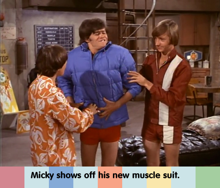 Peter and Davy go back to the pad to update Micky on Bulk’s fate. This doesn’t make Micky any more confident; he still doesn’t have muscles. Davy and Peter solve this with a wacky costume. They dress him in football shoulder pads disguised with one of those down-filled winter coats. He practices a new “manly” voice.