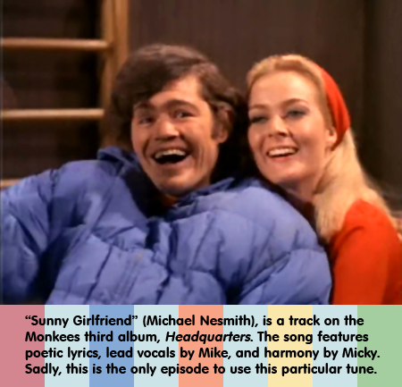 I wish Mike were here too. I hate it when any of the Monkees are missing; It throws the whole dynamic off. Since Mike’s my favorite, it bums me out that he missed the most episodes. He’s also missing from “The Card Carrying Red Shoes,” and only briefly appears in “Hitting the High Seas,” and “The Monkees Watch Their Feet” This episode was shot May 5, and 8-11, 1967, before he went in for his tonsillectomy on May 23. Possibly he was already not feeling well. The Monkees tripod website says he stayed out of this episode due to “artistic differences.” I can’t find any further information on what those “differences” were though.