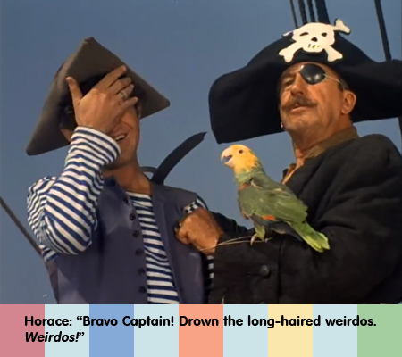 Inside the ship, Davy tries to deliver food to the Captain but keeps running into various other fictional captains. First up is Micky, dressed as Captain Ahab from Moby Dick. He also finds Peter as an 18th-century pirate, getting slapped for forcing a kiss on a girl. Micky re-appears as Captain Hornblower and blows a little horn, “groovy, sock it to me, yeah.” Captain Horatio Hornblower was a fictional captain in the Royal Navy during the Napoleonic Wars and was the subject of novels, films, and radio. According to his characteristics listed on Wikipedia, Hornblower was tone deaf, so he probably didn’t play the horn or anything else. Also, like Mike, he tended to get seasick.