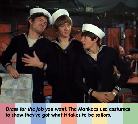 Micky, Davy, and Peter sit in a bar discussing their recent firing from a failed gig. They overhear two sailors, Frank and Harry, discuss an available job. Noam Pitlik, whom we saw in an earlier episode, “Everywhere a Sheik, Sheik,” as Shazer, plays Harry. The old sailors describe the perfect men needed for the job, while the Monkees counter with demonstrations of their qualifications. “They’ve got to be strong.” Micky destroys furniture. (Yet he wasn’t able to do so in “Wild Monkees.”) “They’ve got to be able to use their hands.” Davy juggles. “They’ve got to have knowledge of the seven seas.” Peter names random bodies of water. The sailors wonder where to find “hard drinkin’ guys like that.” The Monkees heartily drink their milk. (Yes, milk – it does a body good.) One of the sailors asks, “what about these kids here?” The Monkees magically pop into sailor costumes. Frank and Harry tell the Monkees where and when to meet them if they want the job.