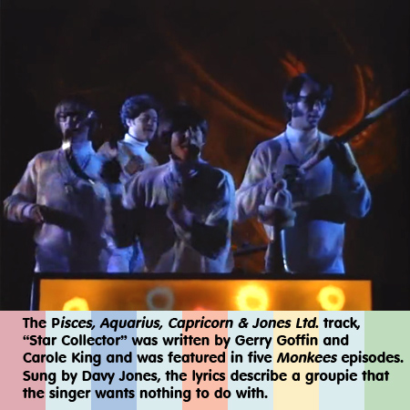Last up is a lip-sync performance of “Star Collector” (Goffin/King), the version of the song that utilizes a Moog synthesizer. Davy Jones mentions the Moog in the commentary and states that Micky owned one of the first existing models. The inventor of the machine, Robert Moog, brought it to the recording session and they played it for this song. In the clip, the Monkees are all in white turtleneck sweaters. It looks like someone made Mike a matching hat, but he never wears it, it just sits on a stand in the front. It’s all very psychedelic with trippy lights, colors, and fast editing. Micky has giant drumsticks and at one point, Mike grabs one to mimic his guitar playing.