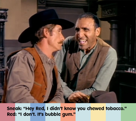 Black Bart walks into his hideout without his mask, and if the audience didn’t catch on before, he is Ben Cartwheel. Bart wants to know who betrayed them to Kate. Red identifies the “Injun” as the one who went to the ranch. Ignoring the pejorative term for moment, clearly the joke is that Peter looks nothing like a Native American. Micky pretends not to know Peter, but when Bart orders Micky to kill Peter, he admits Peter’s his best friend. Red and Sneak draw guns on Peter and Micky.