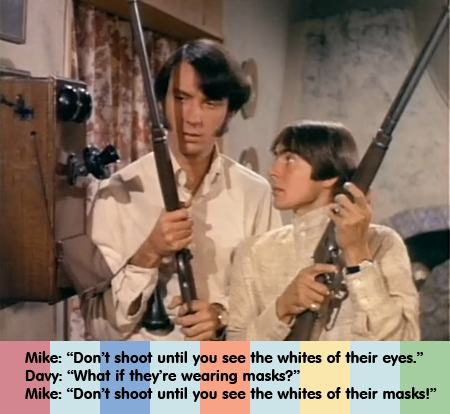 The Monkees help defend the house, except Peter uses a finger gun and “fires” by saying “bang-bang-bang!” Peter explains to Davy, “Well, I hate violence. Besides I have more shells than you.” (Peter also used a finger-gun in “Monkee See, Monkee Die.”) The lead bandit asks, “Have you had enough, nesters?” Mike corrects them, “The name is Nesmith!,” a callback gag to the times Mike’s name has been mispronounced (“I’ve Got a Little Song Here,” “Monkee Mayor”). Aunt Kate corrects Mike that “nester” means farmer, so Mike politely allows the bandit to go on.