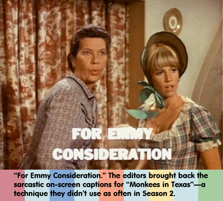 This is the first of two Emmy jokes in the episode. The Emmy’s were given out on June 4, 1967, so by the time this was shot in October of 1967, James Frawley, who directed this episode, had already won the Outstanding Directorial Achievement in Comedy for “Royal Flush” and The Monkees won for outstanding comedy series.