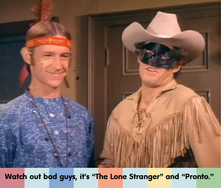 Micky and Peter’s idea of looking “Western” is a Lone Ranger and Tonto look, parodying the popular Texas Ranger and his Native American friend characters of radio, television, comic books, and films. Micky and Peter are “The Lone Stranger” and “Pronto.” (Looney Tunes also did a Lone Ranger parody, “The Lone Stranger and Porky” in 1939). Peter is unsure of his outfit, as he should be since they both look like they’re wearing little kid’s Halloween costumes. But Micky reassures Peter that he looks very “psychedelic” because of the peace symbol and beads. [“Dirty hippies!” – Editor’s Note]