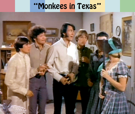 Once they get out of the cart, Mike explains to Peter, and the audience, that they’re in Texas at his Aunt Kate’s house. (Michael Nesmith was born in Houston, Texas.) The Monkees hear gunfire and duck for cover. Two women in 19th-century Western costume ride up on horses, and Mike identifies one of them as his aunt. Three masked men in black arrive and shoot at the women while the Monkees run inside to help Mike’s aunt.