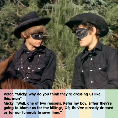 Peter and Micky hang out in Black Bart’s shack, where Micky plays cards with Red. Sneak busts in and declares that now’s a good time to attack Nesmith’s ranch. Peter sneaks out of the hideout and rides a horse right into the front door of Aunt Kate’s house to announce that Black Bart and his men are coming. When Davy rushes to get help, he accidentally falls on the horse the wrong way and rides it backward. He finds Ben Cartwheel, who instructs Davy to tell Kate he’s coming with his men. Davy makes the return trip backwards too; cool trick on Davy Jones’s part.