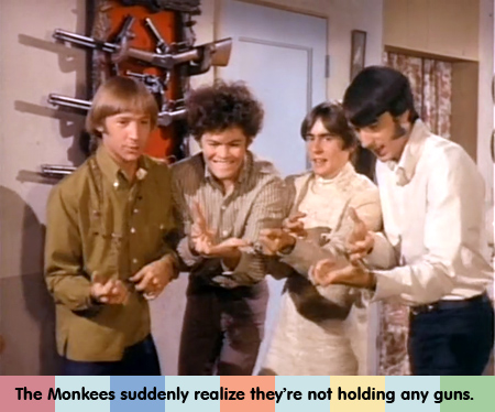 I’ve seen it noted that the “bubble gum” joke was meant to be a reference to the Monkees “bubble gum” image. Could be, but I’m going to take it a different way. The “family show” joke suggests that the writers/producers wrote many subversive jokes that were aimed at adults. With the bubble gum vs. tobacco, Peter ordering milk from the bar, and Micky’s line about the “family show,” and all of the gun violence and the Monkees playing around with the guns pretty much consequence free, they’re making fun of the idea of what a kid’s show should be. Most recent kid’s shows I’ve watched with my daughter are sanitized and full of “lessons.” No thanks. (Please, no morals.) At the same time, the Monkees act like kids most of the time, and they put kid’s jokes in an adult context, such as real Westerns which tend to be violent and aimed at adults, etc. The contrast makes The Monkees an unusual show. Other shows that pull this off successfully tend to be cartoons like Looney Tunes or Animaniacs.