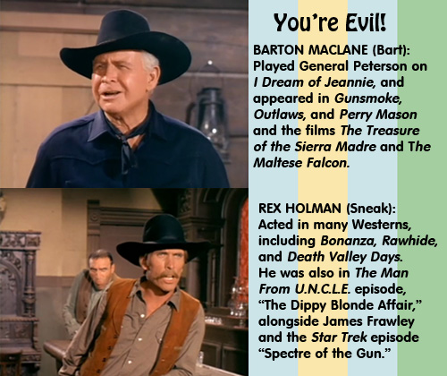 Micky and Peter enter the saloon as a Western-style version of “The Old Folks at Home” (Stephen Foster) plays. (Davy performed this song in “The Spy Who Came in from the Cool,” and “The Case of the Missing Monkee.”) They get another of those “funny” looks, this time from the bartender. Micky bumps into a mustachioed cowboy at the bar, who is clearly Davy. A saloon girl grabs Micky, who protests with, “Not now, this is a family show!” The bartender is skeptical of this, “Family show?” When Micky and Peter look for hired guns to fight Black Bart, they meet Sneak and Red. There’s a misunderstanding, and Red ends up recruiting Micky and Peter into Black Bart’s gang. (Red is played by Len Lesser, who played George in the Western/gangster-flavored episode “Monkees in a Ghost Town.”)