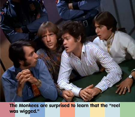 Back in their room, Mike suggests if they can’t find the crooks, they should get the crooks to find them. Peter suggests, “Why don’t we open a prison?” The other Monkees immediately jump on him for the “stupidity” of that suggestion. But not really; they’re clearly being ‘meta’ and reacting to the stale jokiness of the written dialog. As in the scene with Della, they’re way outside the actual episode and commenting on the story and the writing, not really acting in character to mock Peter. Mike “comes up” with an idea, which we hear as mumble, mumble, rhubarb, rhubarb.