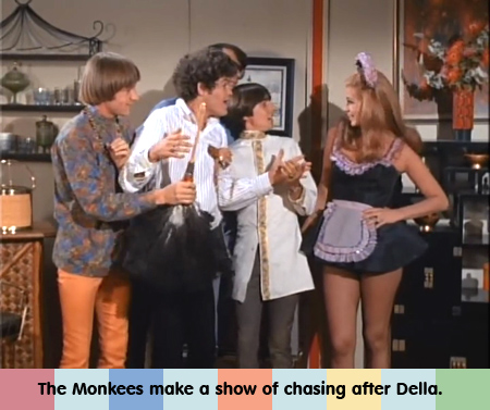 Next, Della the Decoy walks in the room, dressed in a sexy maid’s costume and the Monkees all go nuts for her. Peter: “Are you the maintenance man too?” Della: “Sure. Don’t you like the way I’m maintained.” The Monkees stumble over each other to try and pick her up. Behind them, Biggy’s making off with the money. Della’s not really a decoy, she’s more like Della the Distraction. Also, we’ve seen the Monkees interested in girls before but it’s usually romantic. We’ve never seen them this out-and-out horny. (Maybe Micky from time to time.) The Monkees make an over-the-top spectacle of being all over Della, instead of acting in character.