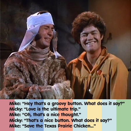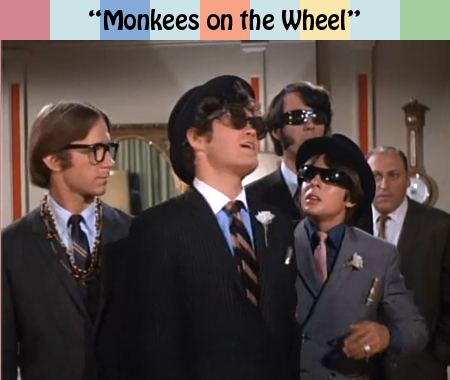 To me, this episode had a different tone than the others. There was a lot more sexual humor than usual. As a five year old, I wouldn’t have understood it. As a teenager, I loved it for being naughty. It’s also unusual for the amount of fourth-wall breaking. As in “Hillbilly Honeymoon” and “Wild Monkees” they draw a lot of attention to the fact that it is indeed a television show. They reached a point where instead of parodying everything else in Hollywood, they made fun of themselves. The Monkees seem to be rebelling against the format of their very own show when they break down the tag sequence and mock their usual treatment of Peter, etc. They don’t leave the audience out of this; we’re in on the joke. I like this, but I also like it when they’re truly engaged in the story-lines. Fortunately, there were a few more of those episodes left before the series ended.