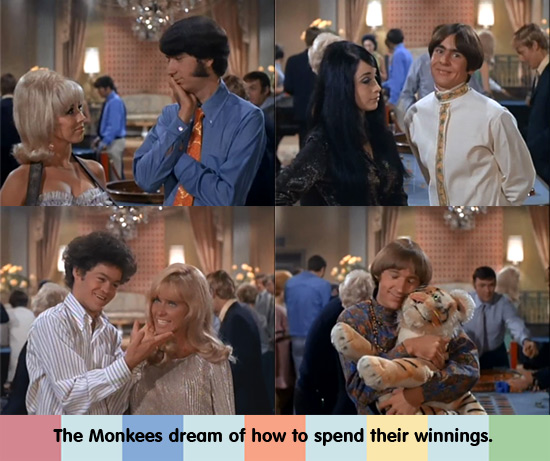 “The Monkees on the Wheel” debuted December 11, 1967 and was directed by Jerry Shepard. Shepard was mainly an editor on The Monkees, but he directed “The Monkees Get Out More Dirt.” Episode writer was Coslough Johnson, who wrote “Monkees on the Line” and many more. The episode starts off with a stock footage shot of the Las Vegas strip, and the narrator sets it up [“Submitted for your approval…” – Editor’s Note], “Las Vegas, pleasure capital of the world, where each man seeks the things he loves most.” He repeats the phrase “the things he loves most” a few times, and we see a foreground of a casino. In the background, lecherous Monkees literally chase girls. Mike rubs his hands together as he tries to catch one, and Davy zeros in on a girl’s derriere. It’s pretty darn funny to see, and it sets up a tone that’s bawdier than most episodes. I’m thinking they were going for a Rat Pack, Ocean’s Eleven (1960) vibe on this one, doll-face!