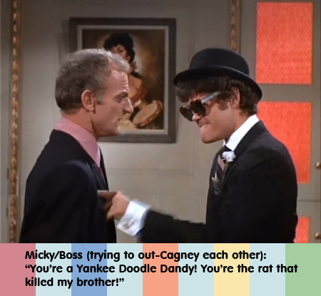 Micky identifies Mike as Vicious Killer and says he did two years of solitary confinement, standing on his head. The editors flip a shot of Mike upside down. “The Professor” tells Biggy they’re here to “take over this town and win all the money.” He starts to tell Biggy about his mathematical system, which is almost perfected. Biggy gives him the missing piece: 7+5 equals 12 (not 11). Peter gets excited, “My system is perfect!” Upside down shot of Mike repeating the line “isn’t that dumb.” All of the action above was intercut with shots of Rip Taylor, carrying on behind the roulette table. The Monkee gangsters go see the Boss in his room. Micky has a Three Stooges/James Cagney impression contest with the Boss. I think it’s a draw.