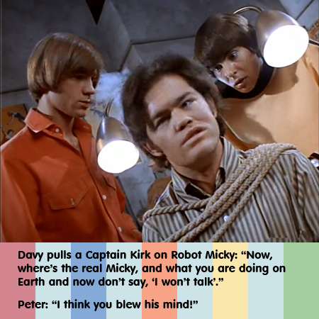 At the pad, Robot Micky behaves strangely. He reports back to the aliens through a microphone on his thumb, he thinks the phone is a “Pussycat,” and he tries to ask the fridge out on a date. Davy and Peter point out his odd behavior. When Robot Micky tries to kill them with dynamite, Davy and Peter subdue him, tie him down, and go over his body with a checklist. They discover the backwards feet and surmise that he’s not Micky. Robot Micky’s head swivels around and says, “Klaatu, Barada, Nikto” referencing the 1951 sci-fi film, The Day The Earth Stood Still, another film that, like Invasion of the Body Snatchers, was a commentary on cold war politics. Micky also quotes Forbidden Planet: “My Name is Robbie the Robot.”
