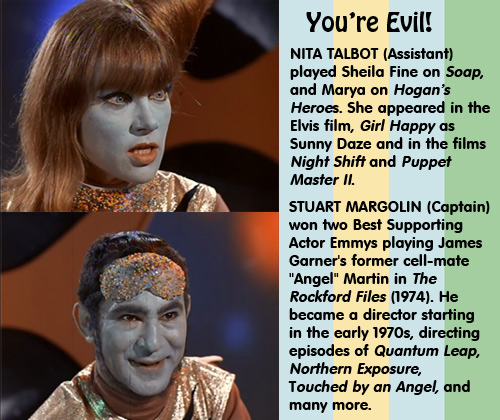 Micky is friendly to the aliens, wandering around and admiring their “pad.” He pulls a handle that traps him in a cage. The aliens try to duplicate him. Their first attempt is a gorilla (actually a man in a costume as seen in “Monkees Chow Mein.”) The Assistant, who is clearly the one in charge, tells the Captain to reduce the brain tissue and lower the IQ. This does the trick. She tells the Captain that Robot Micky will spy, while they question the real Micky, who appears stoned inside the alien cage. One flaw in this plot for me, the usually quick and clever Micky is required to be naïve and passive for this to work. On the other hand, this is Paulsen’s view of Micky, not the Monkees point of view, so maybe this is his convenient (to the plot) version of him.