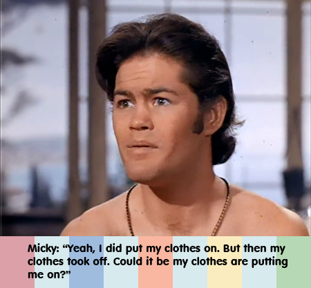 Paulsen describes the boys as “three average, typical young American teenagers with their own television series.” The scene moves into the Monkees living room, where they’re getting dressed. That must have been some party, if they left their clothes in the main room. Davy nags the others to hurry so they can start rehearsing. Micky’s clothes vanish with “pop” sound effects, and Davy scolds him that he’s supposed to be putting his clothes on.