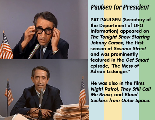 The episode begins with Mike in front of an American flag. “Battle Hymn of the Republic” (Julia Ward Howe, 1861) plays, adapted by Monkees composer Stu Phillips. The flag in the background has only 35 stars, the official flag in 1863. The scene has a very official “State of the Union” address vibe. Mike speaks into the microphone, “Ladies and Gentlemen, this evening RayBert Productions and Screen Gems, with its usual lack of cooperation from the National Broadcasting Company, is pleased to present this special report from the Department of UFO Information. Ladies and Gentlemen, the Secretary of the Department of UFO Information, Mr. Pat Paulsen.” They start right out with a jab at the Network with the “usual lack of cooperation from the National Broadcasting Company.” Unfortunately, that’s all we’re going to get of Mike. (He was recovering from his tonsillectomy during the dates when the initial scenes were shot, according to the book, The Monkees Day-By-Day by Andrew Sandoval.)