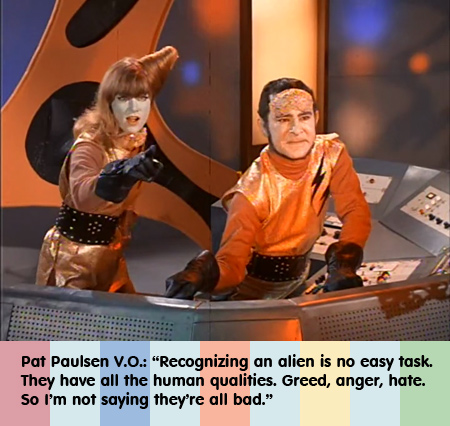 Obviously, I dig this episode a lot. It’s got it all; mockumentary, sci-fi, and political satire. I have to wonder what it would have been like if they hadn’t added the Secretary of the Department of UFO Information scenes later. I’m guessing another weak story that’s a pale copy of an episode from the first season. There’s not much to the plot, let’s face it. With those Paulsen scenes and narration, the style adds to the substance and the episode becomes brilliant comedy. I wonder how this would play for younger people who grew up after the wall came down. Even for me growing up in the 1980’s I still have memories of the paranoia of communism and fear of a war with Russia so this episode strikes a chord with me. I do think that even today there’s plenty of government conspiracy and fear of “others” that makes this all sadly still relevant.