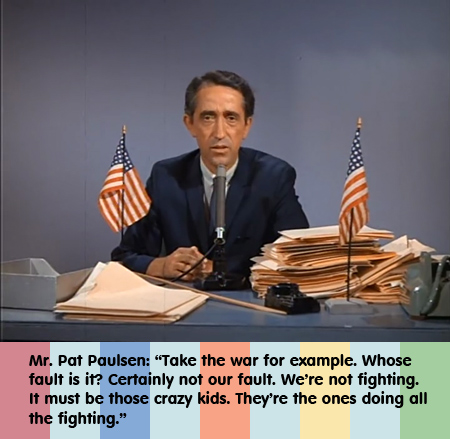 Paulsen waves his pointer stick to emphasize his words, comically off-rhythm with himself. (That’s probably harder to execute than you’d think.) He ponders, “Whatever happened to the good old days? Perhaps you figure that the more days that go by, the more good old days there are to miss. That’s tricky thinking and not the answer. Today is not a good old one, because the aliens are causing riots and crime waves, drug addiction, unemployment, etc. They want to put the blame on teenagers.” This is accompanied by a clip of screaming fans from “Monkees on Tour.” Then, and a subversive stab at the Vietnam War and reaction to war protesters:
