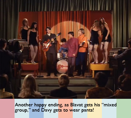 Cut to Davy having presumably just confessed to Blavat, who must be so embarrassed. Blavat yells at him for deceiving him and disqualifies him because the contest called for mixed groups. Davy tells him that’s what they are, and both groups perform “She Hangs Out” (Jeff Barry) all together. Unfortunately, this relegates the girls to go-go dancers on the sides of the stage. Really, they couldn’t let a couple of them have instruments? Let’s assume they won and split the $500 between both bands.