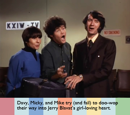 Blavat comes in and declares his love for Davy and sexually harasses him with the promise that if “she plays her cards right” the Monkees could win the contest. Blavat pursues Davy, forcing him to back away nervously. Davy says he’ll have to think about it; Blavat gives him until tomorrow. Watching this in the days after the big Weinstein scandal is a surreal experience. I have to hand it to Jerry Blavat for fearlessly playing this sleazy part, especially since they used his real name.