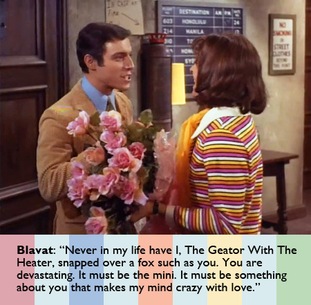 Once they get home, Davy immediately wants to remove this disguise, but the others are worried someone from the show might stop by. Right on cue, Blavat knocks on the door. He has a big bouquet of flowers and wants to see “Miss” Jones. The other three hide, so I guess this is only supposed to be her address. He keeps calling himself, “The Geator with the Heater” and “The Boss with the Hot Sauce,” real life nicknames that he used when he hosted a dance/variety television show called The Discophonic Scene. In the context of him chasing “Miss Jones” however, the nicknames sound absolutely lecherous.
