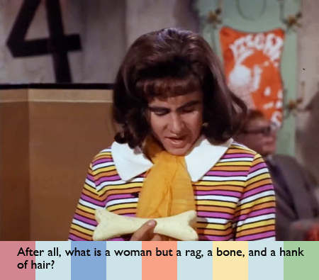 Back at their pad, Davy stands behind one of those old-fashioned dressing screens and questions how they’re going to turn him into a woman. Micky explains that a woman is a “rag, a bone, and a hank of hair.” I tried to find out about this rag, bone, and hair nonsense; it seems that it’s from a poem called “The Vampire” by Rudyard Kipling (1897).