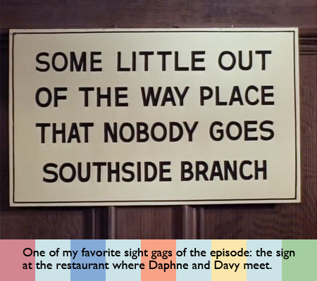 Later, Davy declines to go out to eat with the others and asks them to bring back a tuna fish sandwich. Cut to the Westminster Abbeys having the same conversation with Daphne: If she has to go out as a boy, she won’t go. Cross-cut of Davy and Daphne going stir crazy. They each decide to go to “Some Little Out of the Way Place That Nobody Goes.” Thanks to this sight gag, this turns out to be a literal location: