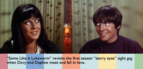 “Some Like it Lukewarm” was a tribute to the 1959 film, Some Like it Hot, starring Marilyn Monroe, Jack Lemmon, and Tony Curtis. In the film, Lemmon and Curtis play two broke 1920’s musicians, who are in trouble with the mob because they witnessed a gangster execution, and so they pose as women and join an all female band. Sounds like a Monkees plot to me. The BFI lists it as one of the films you should see before age 14 [Why that specific age? – Editor’s Question], and it is considered one of the best films of all time. “Some Like it Lukewarm, “ which debuted March 4, 1968, was written by Joel Kane, who also wrote for The Many Loves of Dobie Gillis and Wild, Wild West, and Stanley Z. Cherry who worked on Gilligan’s Island and The Addams Family.