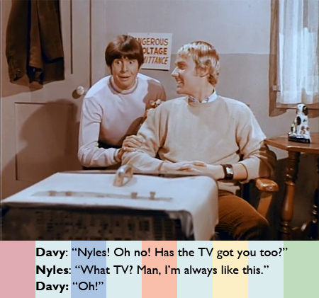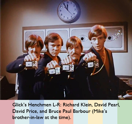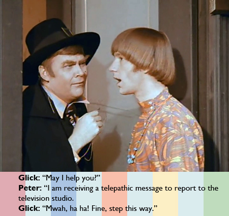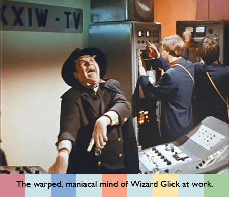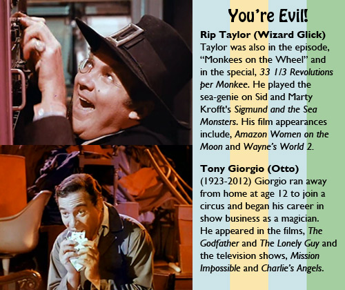 Davy, Mike, and Micky rush over to the television station KXIW (the same television station call letters from “Some Like it Lukewarm”), where they find the stagehand hypnotized by the television eye. Micky wonders, “What kind of a warped, maniacal mind could be plotting such a conspiracy?” Cut to Rip Taylor as Wizard Glick, shrieking, “It’s working!” and laughing evilly. The Monkees apparently saw that scene because they cut back to Micky who tells the audience, “Oh, that kind of a warped mind.”