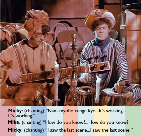 The Monkees are tied to chairs, but they are not hypnotized, which is inconsistent. Micky decides to use mental telepathy to contact Peter to come get them out. Using a chant he got, not as Mike guesses, “while studying transcendental meditation under an Indian mystic,” but rather that came free with a cereal box top. Hilarious double joke at the expense of their sponsor, Kelloggs, and the Beatles’ Maharishi Mahesh Yogi days. Peter hears the message and leaves the house to go help his friends. (Nam-myoho-renge-kyo apparently means “devotion to the mystic law of the Lotus Sutra.”)