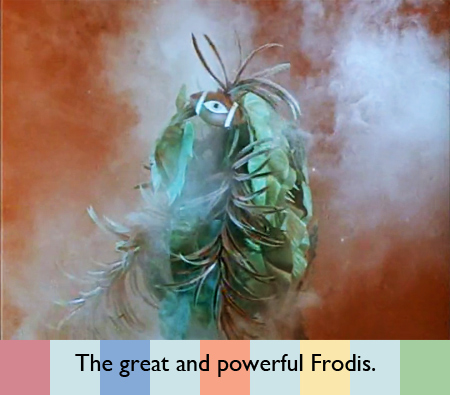 The Monkees (carrying Peter and the Frodis) somehow reach the flying saucer before Glick gets there. As the song ends, the Frodis pops his head out and blows smoke all over the bad guys. Glick is utterly stoned: “I don’t want to fight anymore. I just want to lay down in the grass and be cool.” Frodis laughs in his demented, squeaky little voice. (Micky Dolenz’ own voice) This reminds me of Mel Brooks’ History of the World Part I (1981) when Gregory Hines blows the giant joint onto the Roman soldiers who are pursuing them. Since it’s a film, they didn’t have to be as subtle as “Frodis Caper” but there is a similarity.