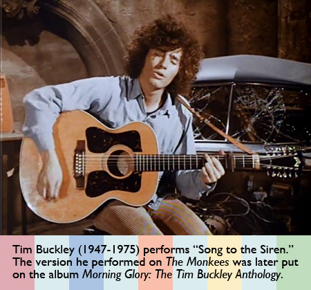 The last segment, and the last scene ever on The Monkees, is Micky’s choice of musical guest, following the precedent set up with Davy/Charlie Smalls and Mike/Frank Zappa. Peter never got to bring his choice of guest on (“Monkees Mind Their Manor” would have been a good spot) but stated he would have wanted to bring on Janis Joplin. Micky introduces Tim Buckley (1947-1975) who sings “Song to the Siren.”