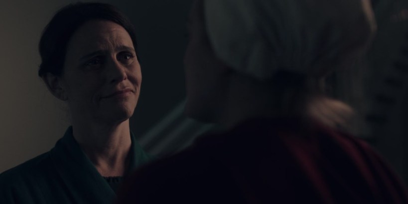 June tells Lawrence her daughter, Hannah, is living by the good graces of a Commander MacKenzie (writing the words of a sermon that no one will hear, no one comes near). She wants to find this guy so she can get back (heh) her daughter. In the aftermath, Serena is a wreck. She makes her intentions known to Waterford of her desire to keep Holly safe from this hellish existence, and being that Fred has no idea what marriage, love, and sacrifice is all about, I predict this will not bode well. Yet, we still go through the hoops of reversal with regard to Serena’s character. The woman is a monster, but the writers don’t want us to hate her. Why? Is it because she’s a woman, and therefore understanding of the bond between mother and child? Is it because women are just plain better than men?