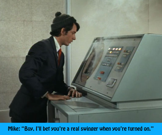 A wonderful example of Mike’s leadership appears in “Monkee vs. Machine.” After Peter is frustrated and humiliated by a computer conducting a job interview at a toy company, Mike takes over and gets revenge on behalf of his buddy. Far from letting the mechanical interviewer rule the conversation, Mike destroys the machine using its own logic against it. He’s quick and funny. I also love the proud yet embarrassed expression that Nesmith pulled off when Toy company executive Daggert comes in to hire him on the spot. Mike is not happy with his new job when Daggert mocks and suppresses fellow employee Harper, a toy maker who loves fun and designing things by hand. Defender of the underdog, Mike leads the others in some Monkees-style chaos aimed at Daggert’s biased and ill-fated toy testing sessions.