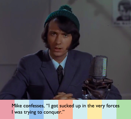In addition to his role as leader and defender, one his notable traits was a desire to be a success. A place where his defender/ambitious qualities met was in “Monkee Mayor.” In order to keep his neighbors from being evicted, so the town could put up a parking lot, Mike decides (with a little push from crafty Micky) to run for Mayor against corrupt incumbent Motley. Mike’s speech at the end of the episode, when he realizes he’s been blindly corrupted by Mr. Zechenbush, was well acted. Mike confesses, “I got sucked up in the very forces I was trying to conquer” and it gets to me every time. Something about the fact that Mike was not a practiced actor made the episodes featuring him really connect. There is also a cynicism present in both “Monkee Mayor” and “Monkees on the Line.” Mike really wants to help the helpless but the world, personified by self-involved Ellen Farnsby and evil Zechen Bush, is not playing fair.