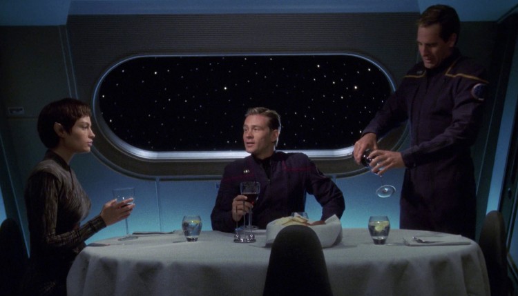 Three Vulcans walk into a bar! No, really. They did. They really did. I’d estimate it’s been about two months since Archer returned from the 31st century with a big can of whoop-ass he opened on Silik. That makes a full year on the job “boldly going yadda-yadda-yadda …” Archer figures it’s time for a little performance review. During a quiet dinner with T’Pol and Trip, he tells her he did some snooping on the shore leave she took on Earth, and noticed she paid a visit to Carbon Creek, a small mining town in Pennsylvania. T’Pol decides to drop the bomb and tell them the real story behind the first contact between Vulcans and Humans. Trip corrects her.