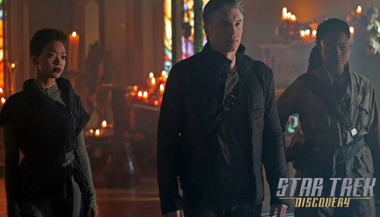 This is the problem with having one lead rather than working together in an ensemble. Every character wandering throughout this series is designed to make Burnham look brilliant. Burnham, Pike, and Owosekun beam down and investigate the source of the signal. They note that the colony’s religion seems to be an amalgamation of every Earth religion, as well as incorporating elements of the “red angel,” with whom they had run-ins a long time ago before their power went out. This is interesting, but we don’t get enough of it.