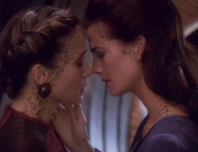 Sexuality and gender were also touched on in episodes such as “The Outcast” and “Cogenitor,” but the arguments always fall flat because of the science fiction/futuristic context, mainly because we’re not dealing with humanity. Instead, we’re being told a story through the eyes and mentality of alien species. Jadzia Dax, as a Trill, is not human, and the “Dax” portion of her knows no sexuality. It is merely a slug that inhabits bodies that can either be male or female. How much of what Dax imparts on the male or female host is another matter, but in “Rejoined,” we’re not left with much in the way of speculation as to how much influence these little slugs have over the bodies they ride.